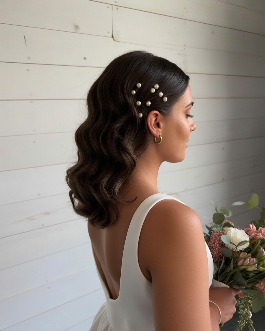 There’s something effortlessly timeless about sleek, vintage-inspired waves. The addition of pearl pins takes this medium hairstyle to a new level of elegance—glamorous without being overdone. It’s soft, feminine, and captures that classic winter sophistication that pairs beautifully with satin dresses and candlelit evenings.