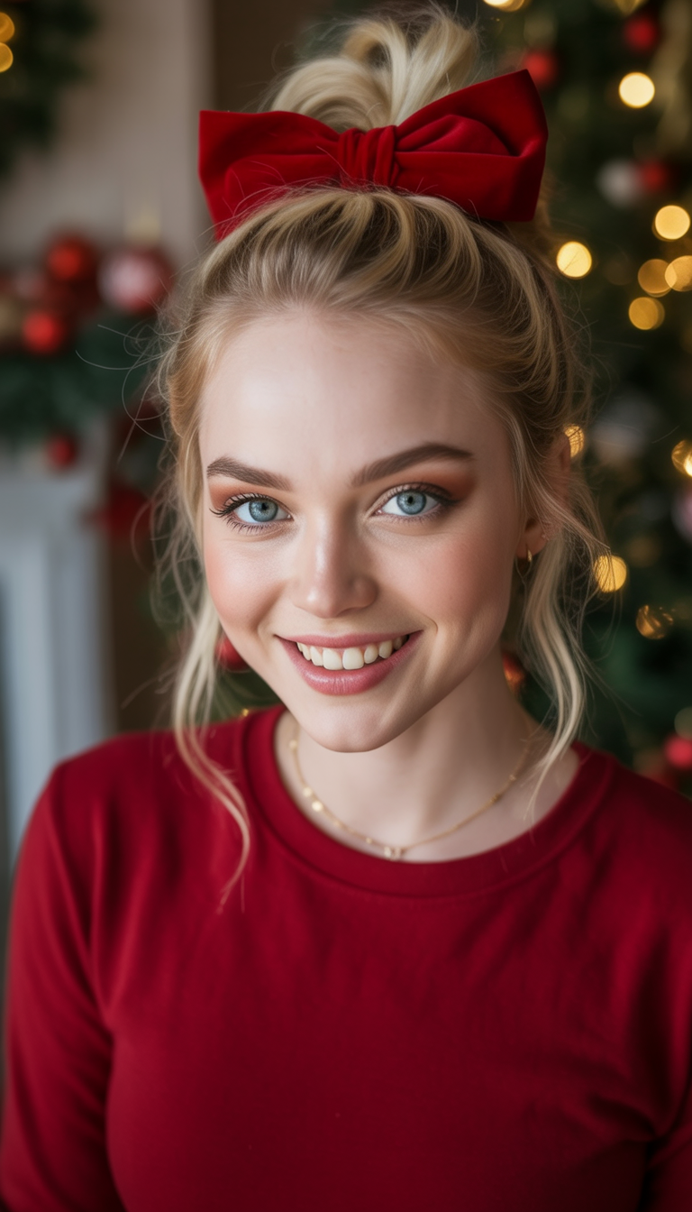 A high, sloppy bun crowned with a bright velvet bow brings in that much-needed playful charm while brightening up everyone’s day. It spells fun and youthful vibes perfect for any early celebration or Christmas morning with family: the messy texture and loose tendrils make it irresistibly flirty and fun.