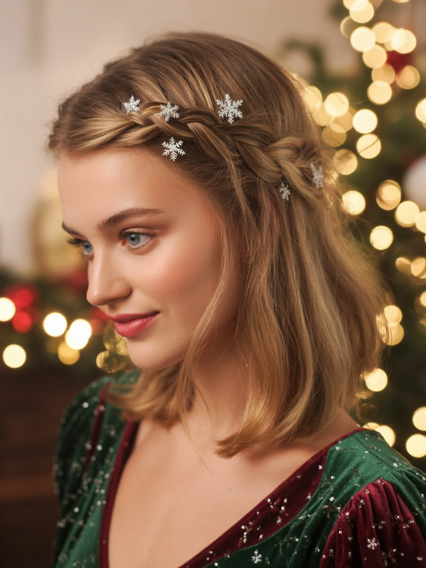 This sweet, whimsical braid with snowflake clips seems like it was made for Christmas morning. It is soft, fresh, and extremely easy-A perfect compromise between festive and feminine. The loose braid falls along the crown so elegantly, framing the face with delicate charm; think of it as an adult version of a childhood holiday favorite, updated for 2025-chic-and-simple.