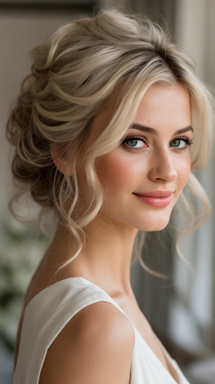 This updo suits women with medium or long hair who prefer easy elegance. It works beautifully on fine or thin hair with the help of a bit of teasing and texturizing spray. The medium simple styling makes it achievable at home, yet it looks like it came straight from a salon chair.