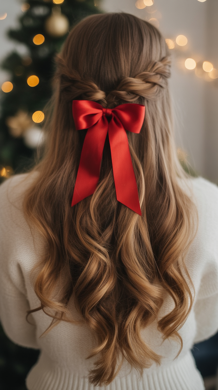 This style is perfect for medium or long hair, especially with natural volume or soft waves. To begin with, collect the hair on the top half of your head in a simple half updo, securing it with an oversized bow. This hairstyle is easy to do at home and gives an impression that hours were spent at the salon. Combine gold accessories or a shimmery dress for that added festive sparkle – it is made for winter holidays indeed.