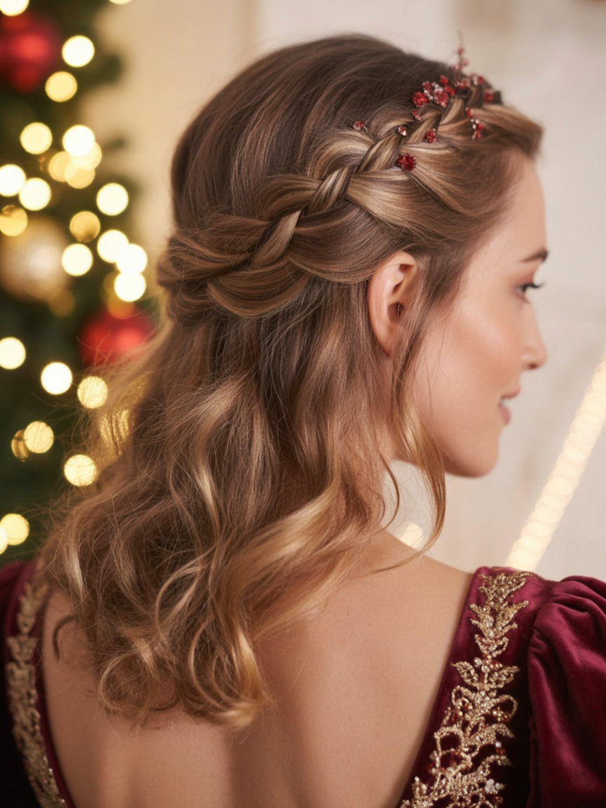 A braided half-up crown lends a fairytale touch to the Christmas season. The very faint sparkle of red accents warmly and cheerfully complements the soft waves flowing down the shoulders. The style is just as much romantic as regal—ideal for holiday soirée chores or family dinners beside the fireplace.