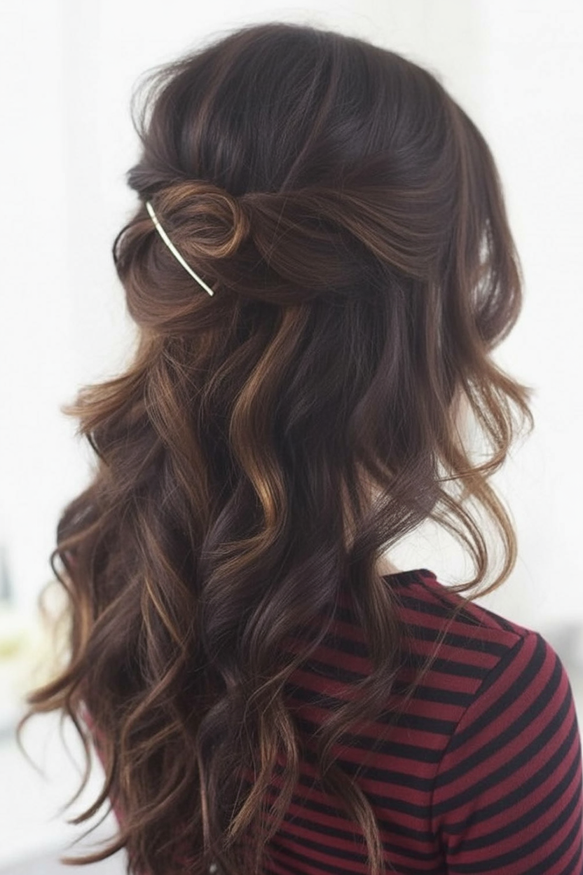For those who love long easy hairstyles that combine romance and practicality, this twisted half updo is pure perfection. The gentle twist at the back adds texture and interest while letting long curls cascade freely — creating that effortless holiday beauty vibe. It’s soft, feminine, and full of movement, like something out of a winter romance movie.