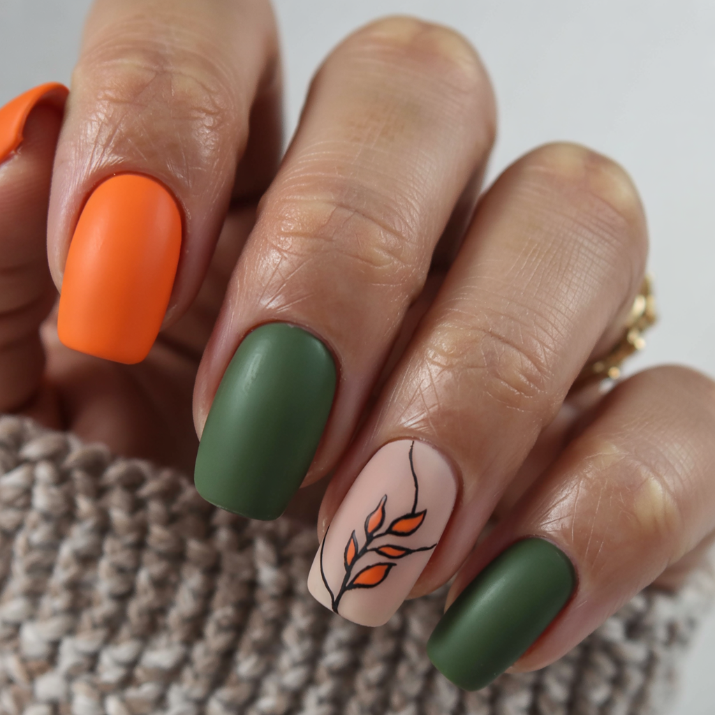 Grand but conservative, the matte manicure is a combination of warm olive and burnt orange and they go nicely together as a golden-hour jaunt through the forest. The single accent nail having the wonderful thin branch decoration lends an elegant, artist flair to an otherwise fun-loving appearance.