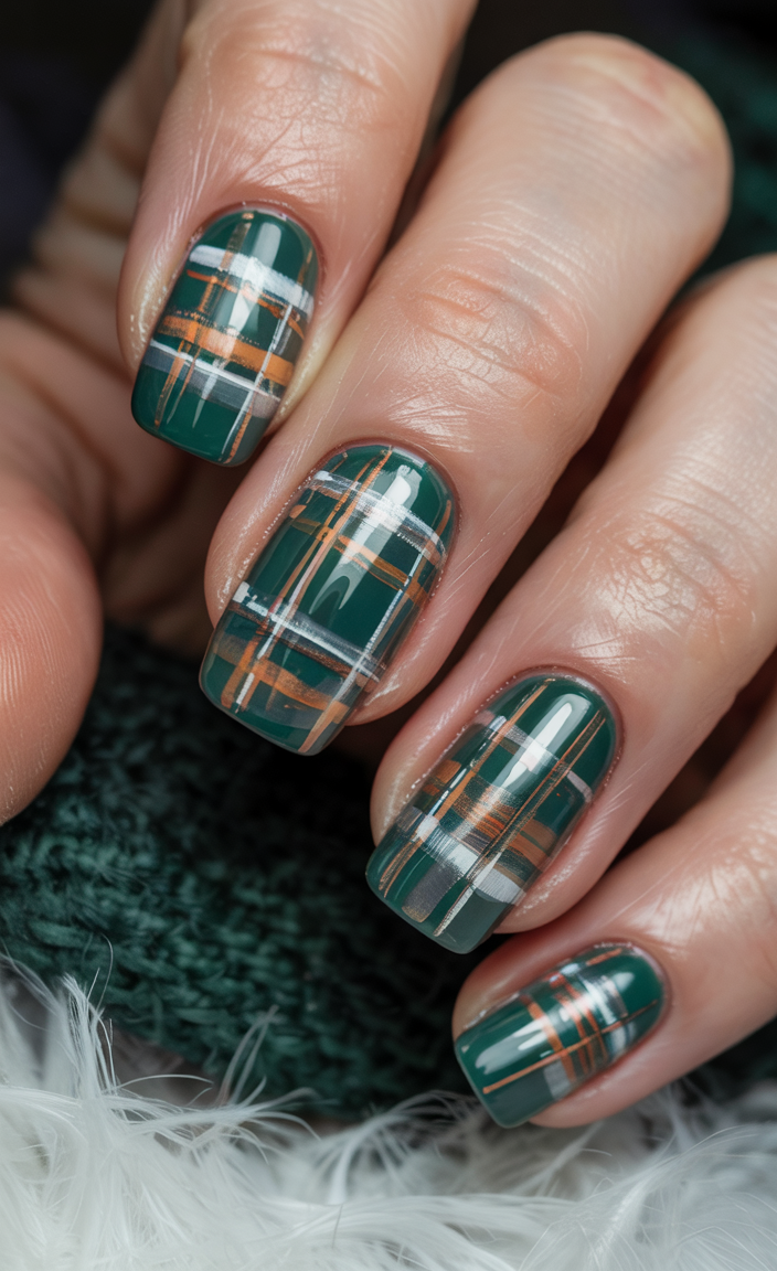 This plaid-ish style is so comfortably warm to look at, as though your favorite flannel shirt became a manicure. The opulent forest green background is reminiscent to a stroll in an autumn wood, whereas the exact shapes of the orange and white provide it the sophisticated touch of a cabin in the woods.