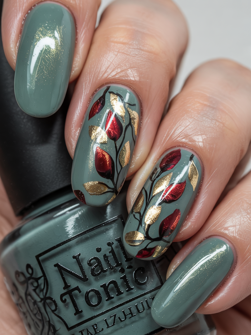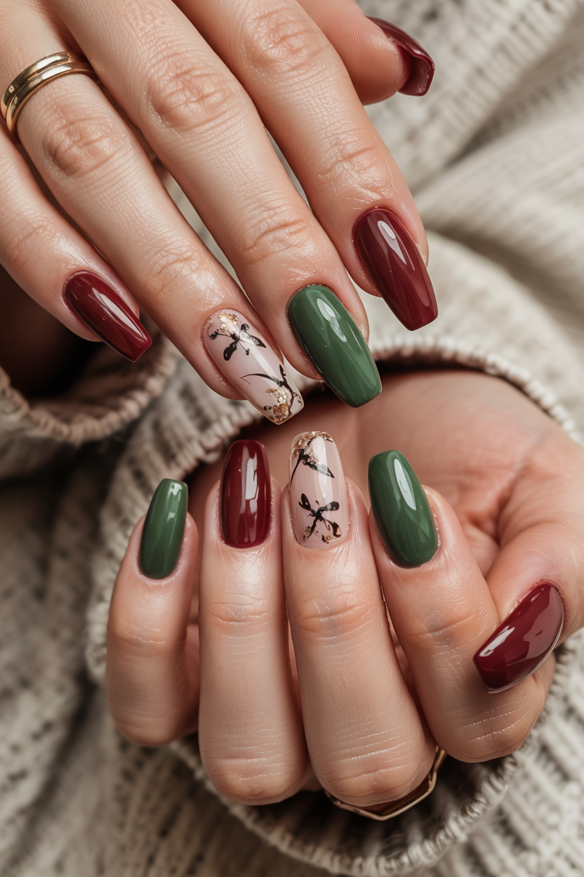 Edgy and wearable, this red and green nail look is the same as fall jacket and lipstick combo in nail polish. and add on those black leafy decorations and buttons of gold, and you have a show stopper.