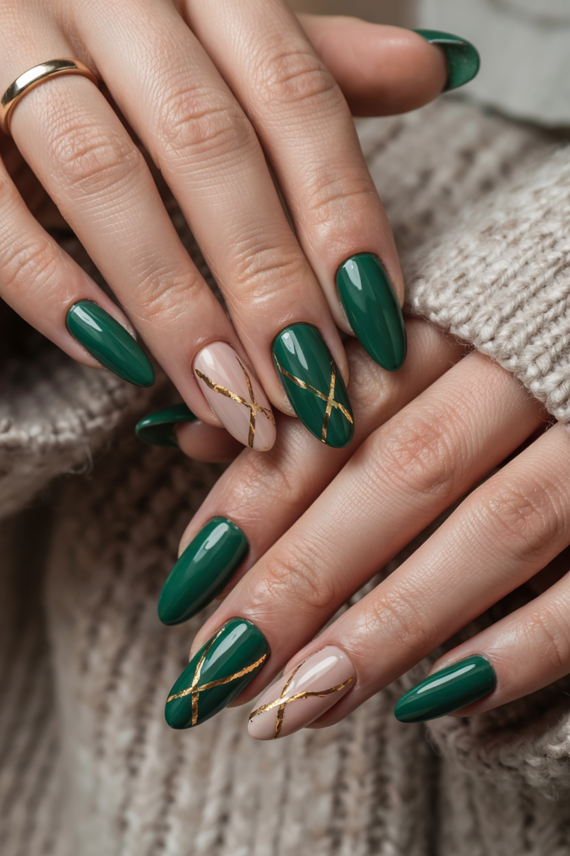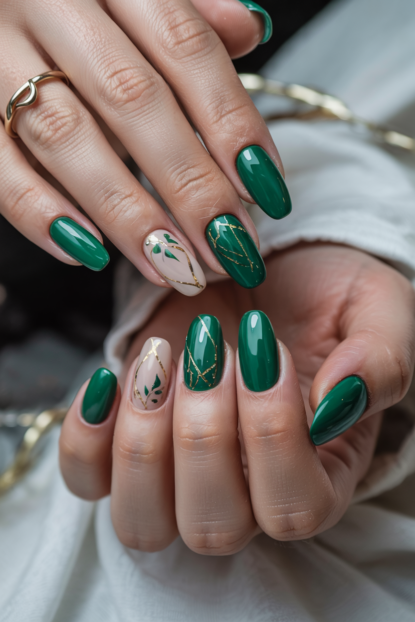 This deep emerald and nude combo in thin gold lines creates a high-end version of fall leaves. The way the colors are combined, is, somehow, kingship, in that it is wearable, though, in a sophisticated manner, never too serious.