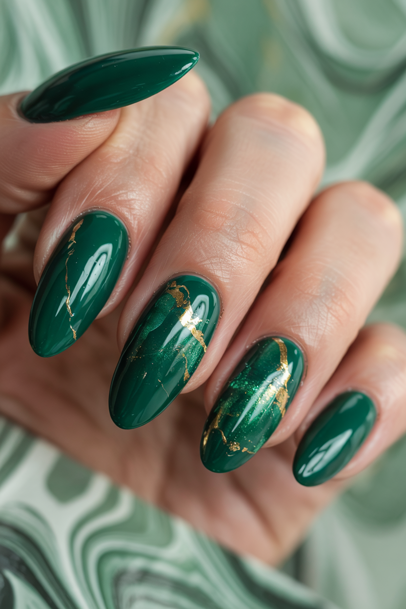 This style is following one of the large 2025 trends: on top of deep jewel colors, there are metallic accents. These are best ob almond or stiletto type nails to really bring out the look, and better again with a shiny opi topcoat to bring out the shimmer. If you’re feeling bold, pair it with a dark green silk blouse and gold accessories.