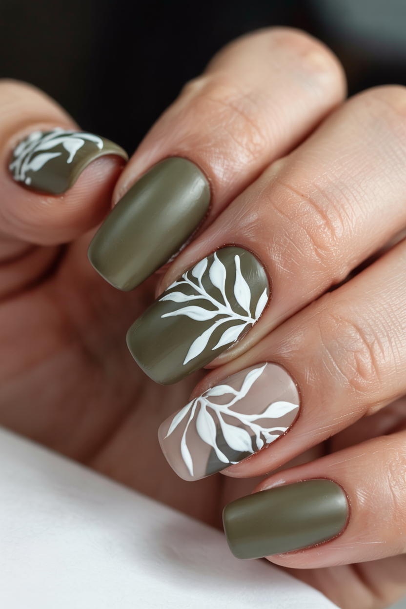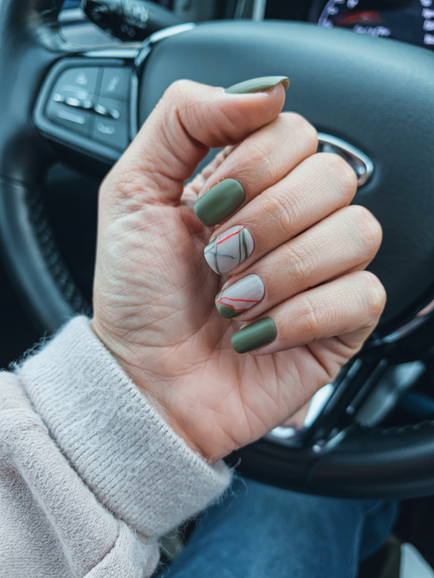 It somehow has an earthy feeling to it not to mention the contrast between this matte olive and crisp white leaf artwork. The feeling with this manicure is minimalist botanical vibe, half earthy, half fancy.