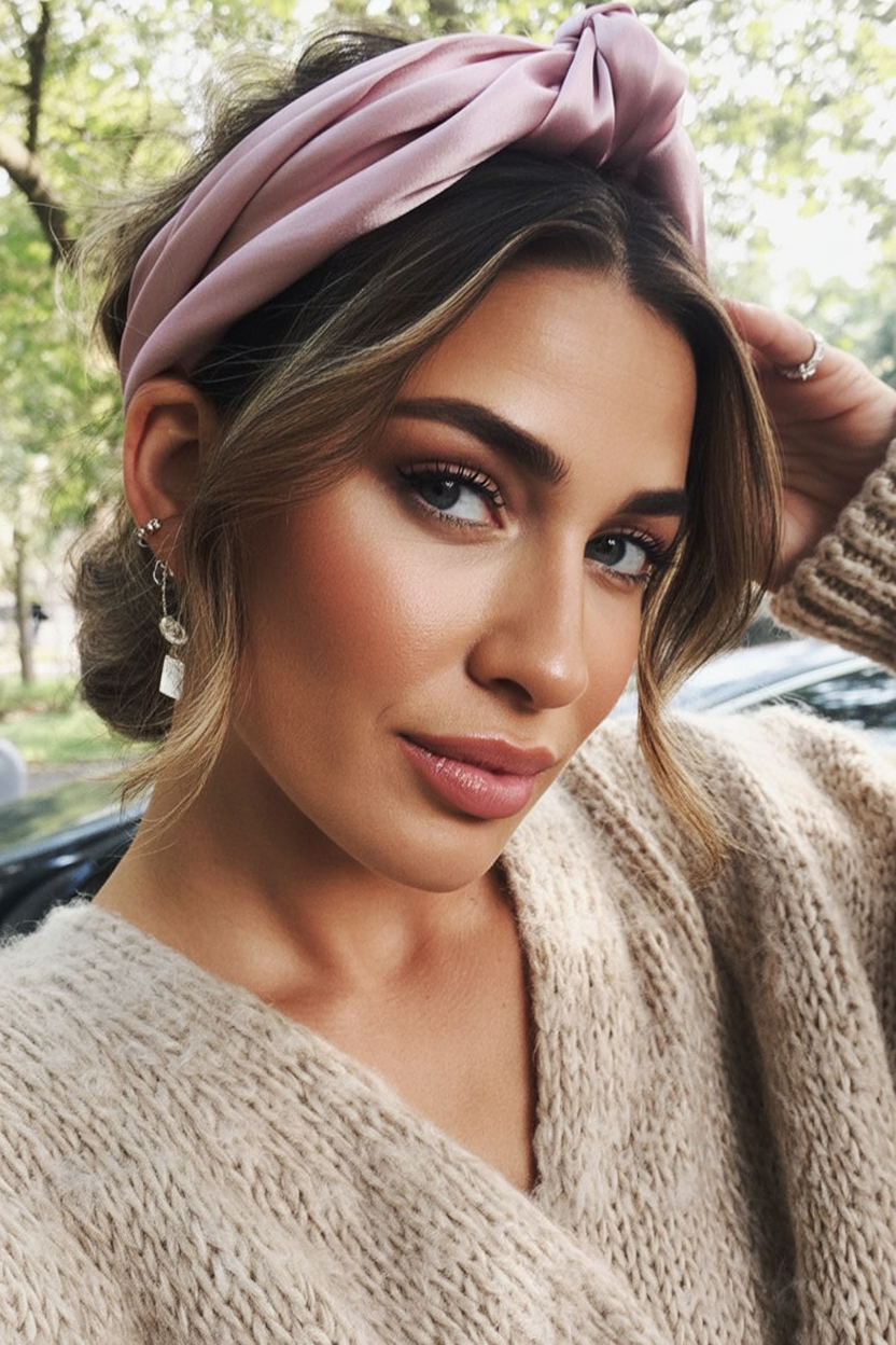 There is a coolness surrounding a mere hair up moment and there is a sparkly element with a headband made of gleaming bronze fabric. With soft waves pulled back into a low ponytail, this look gives off cozy fall vibes, perfect for weekends at the farmers’ market or casual coffee dates.