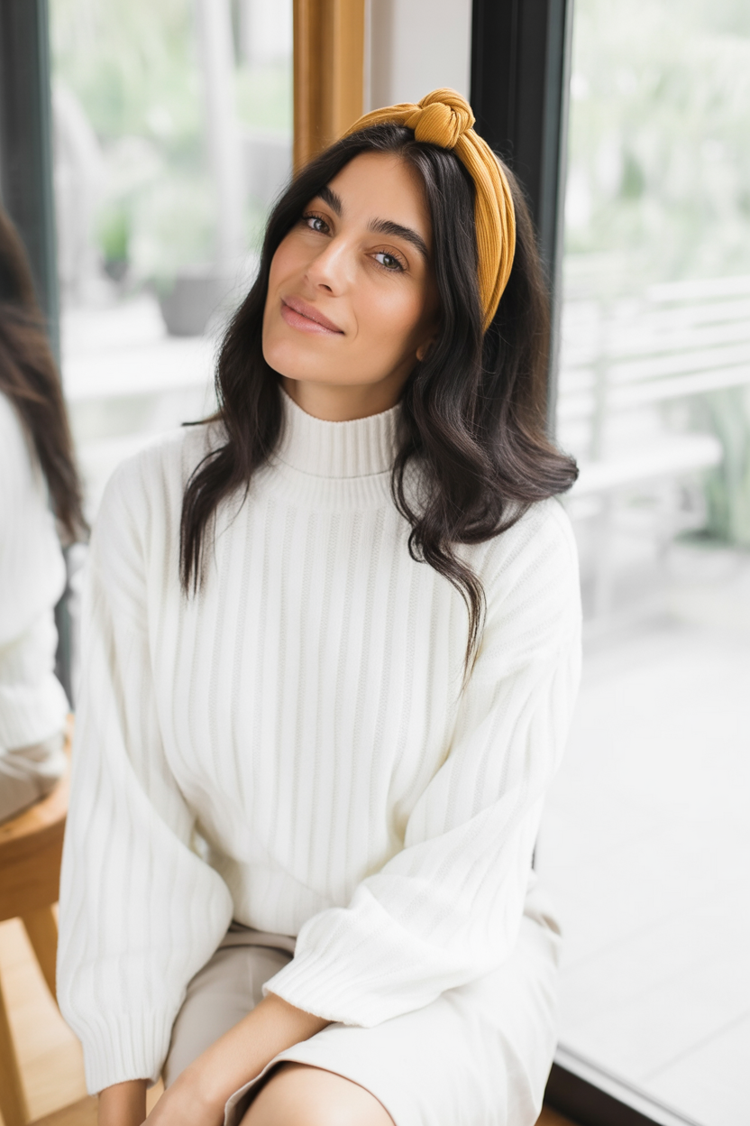 Hello, sunshine in accessory form. This big headband of mustard yellow takes over the floor as it comes outgoing with such an attention-grabbing color as well as messy twist. It looks fresh, but retro at the same time, coupled with a loose, shiny curl, it is a modern-retro combo, such as a 60s reference with a crisp, updated detail. The bright hue warms up a simple ensemble and throws a bit of character in it.