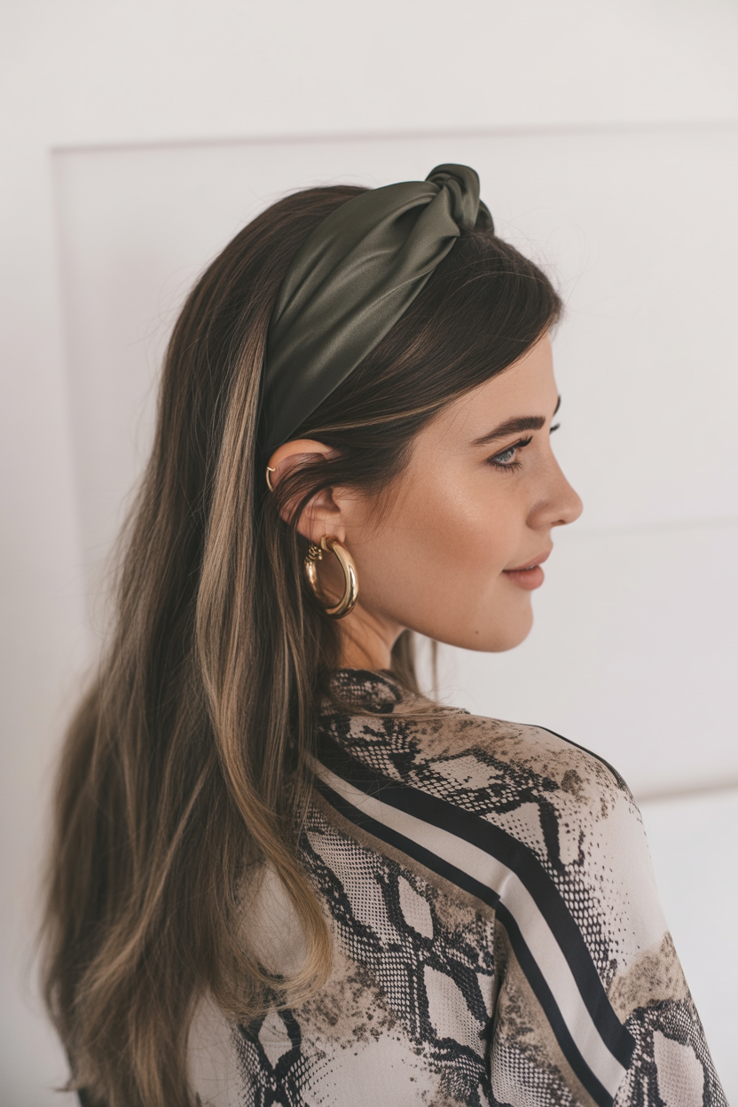 Shy but strong What a power of this sophisticated style topped off with a silk headband olive green. The bizarre style is almost sculptural giving it the feeling of elegance with not overpowering the outfit. It’s the kind of chic that whispers instead of shouts. It is an attitude by itself when paired with hoop earrings and printed top.