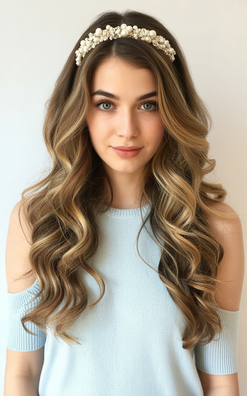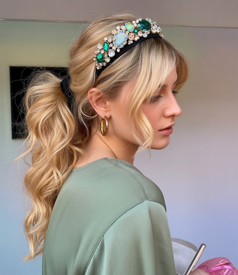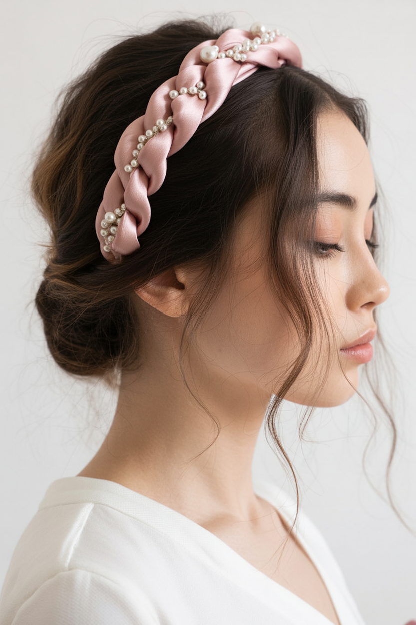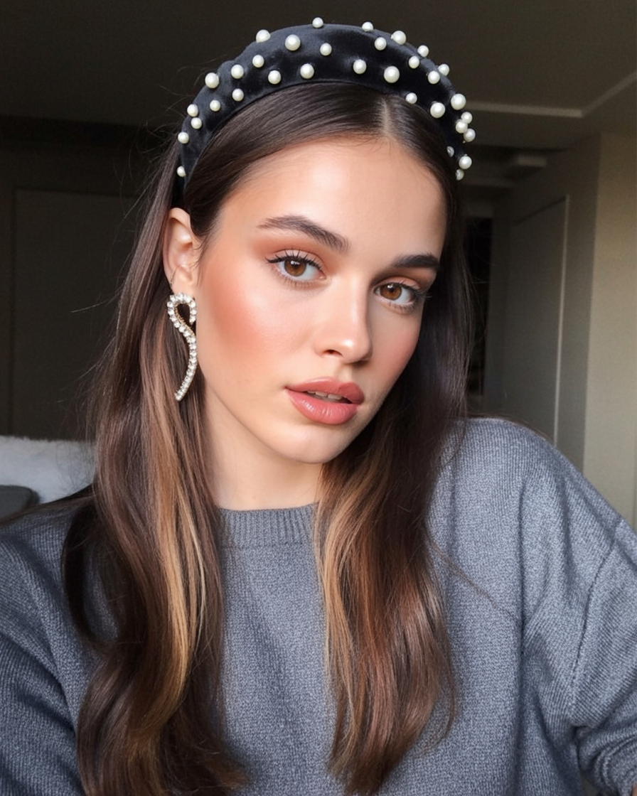 Drama talk, the idea of having a headband that is padded, bridal worthy with pearls dripping on it, gives the glam of old Hollywood into 2025. This look that is donned with smooth, center-parted strands and accessorized with sparkling statement earrings is as graceful as edgy as you would want it to be.
