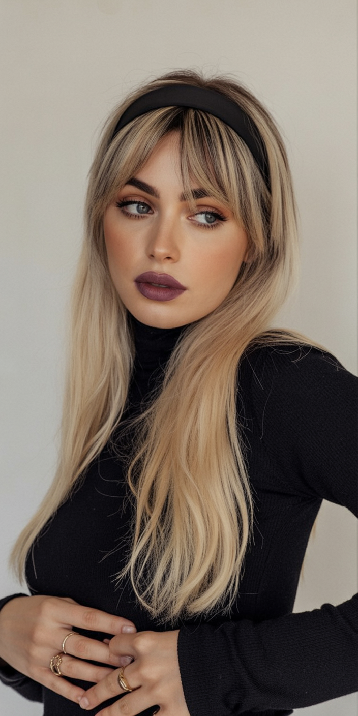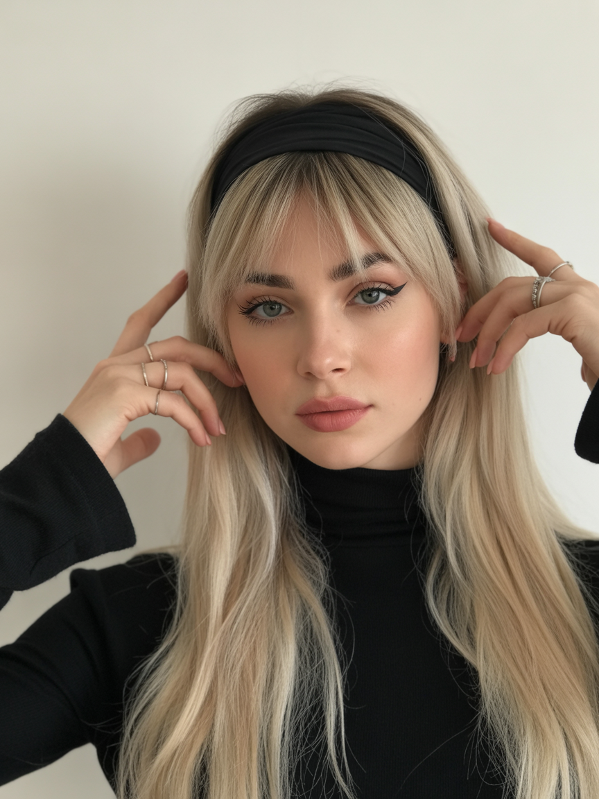 Clean, minimal but packed with quiet power that effortlessly falls on the side of the timeless style with a sharp black headband and soft with bangs framing the eyes. It is Audrey Hepburn in the year 2025 with a hint of cool-girl quirkiness because of the smooth icy blonde hair. The turtleneck just adds to the sophistication.