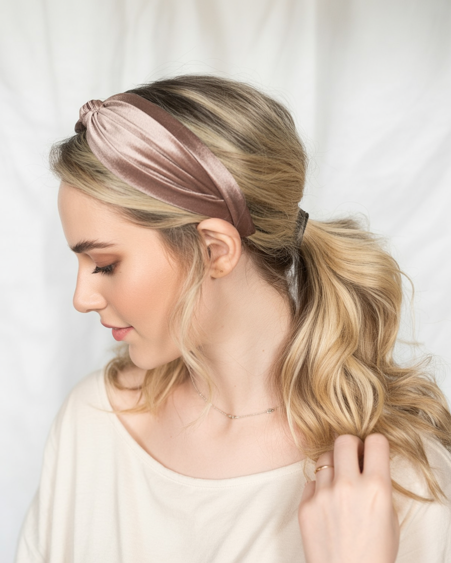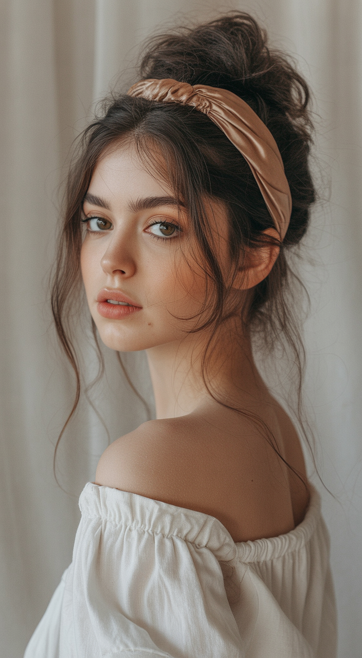 It appears as a poem, it is pliable, romantic almost unfinished in the most purposeful manner. The silk taupe headband tucked into a voluminous messy bun and wispy strands evokes the charm of a sunlit artist’s loft. It’s feminine without being fussy and would be right at home with a flowy blouse and delicate jewelry.