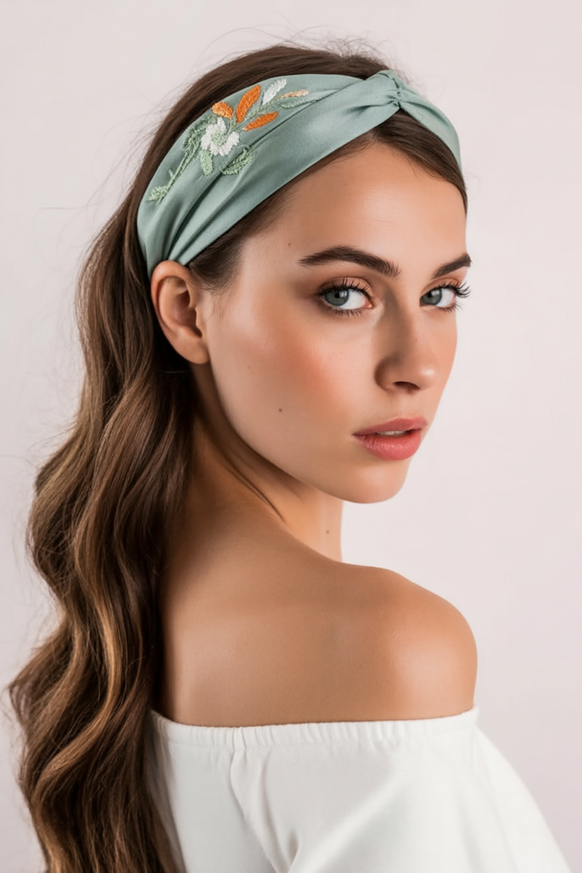 It is a breath of fresh air this embroidered sage headband; subliminal, whimsical and completely refreshing. The romantic silhouette is slightly boho leaning with the puffiness of the soft waves also adding an airy movement that goes well with its floral embroidery design. It works best on days when you want to be dreamy yet you do not want to be over-dressed.