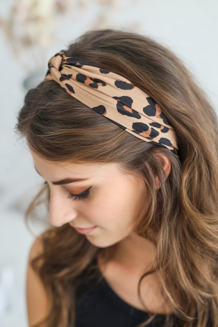 Feeling a little bold? It is a leopard print headband that will get you to fun in a hurry. It reawakens the Y2K nostalgia just the right amount and maintains the vibe of the whole atmosphere as adult and chic. The off-centered parting and the loose waves make it flirty, yet the garment print announces, “I know what I am about.”