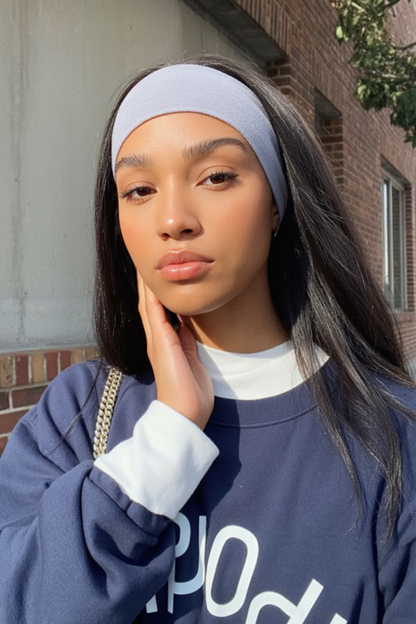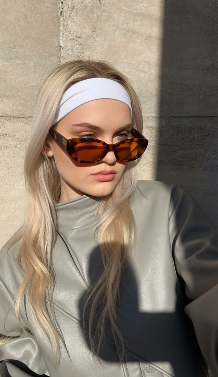This headband moment is straight out of the Y2K revival playbook — and it’s giving edgy, sporty chic. The sports feeling is brought up with platinum-blonde hair, large sunglasses and the jacket that is made of leather. It is the type of stare that anyone would be walking down the street thinking it is his or her runway.