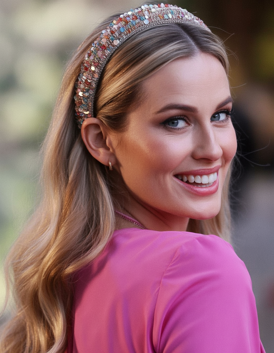 This look practically radiates joy. The sequin studded wide headband in beads is just lovely and adds a double dose of gems to soft wavy golden hair. Whether you’re headed to brunch or just feeling fabulous, this look says you’re not afraid to have fun with fashion.