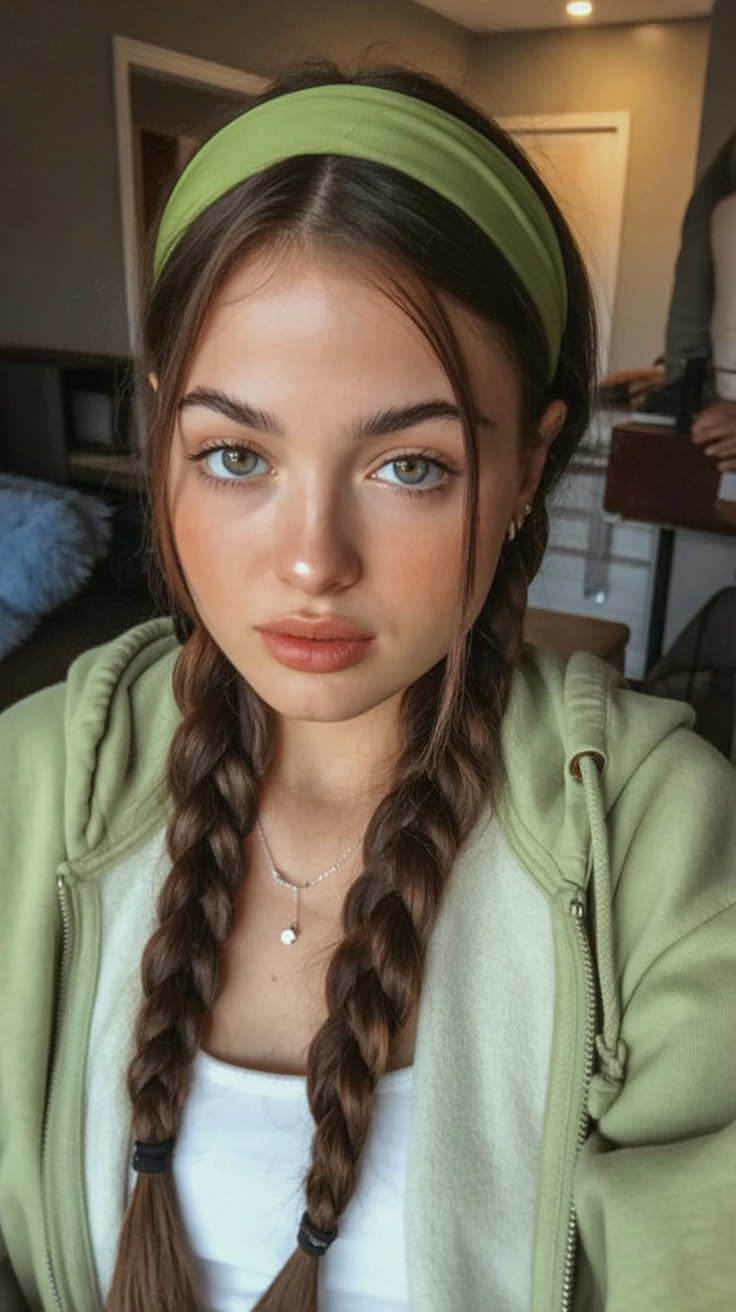 This one’s full of personality. The braids bordered with face-framing strands and soft olive headband exude youthful appeal which is both carefree and sure of itself. It is your favorite hoodie but more so with the added benefit of a hair glow-up to it.