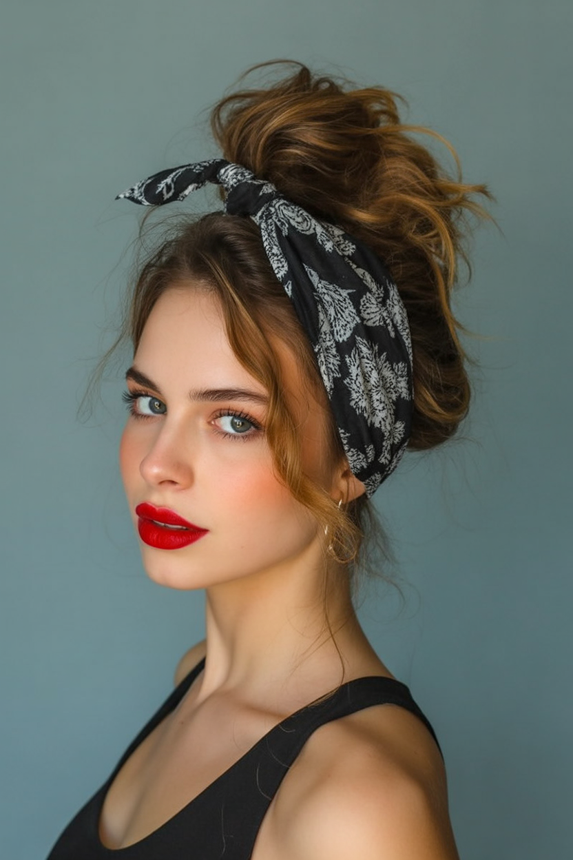 It is a perfect style with curly hair whether long or short because it does not require any level of perfection to make your makeup visible. Simply put your hair together lightly and fasten it and bind a printed bandana. It is the best messy bedhead look, but prettier.