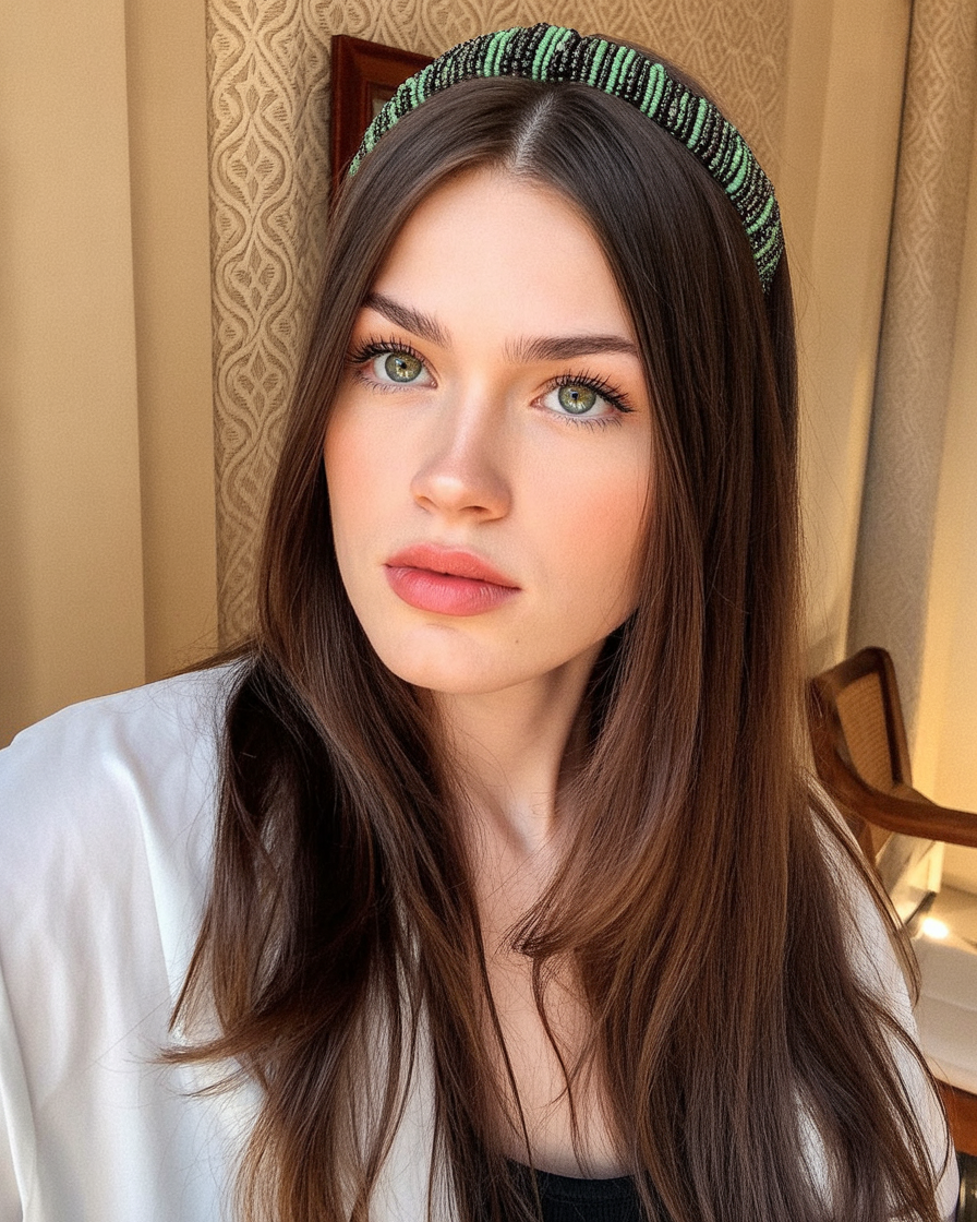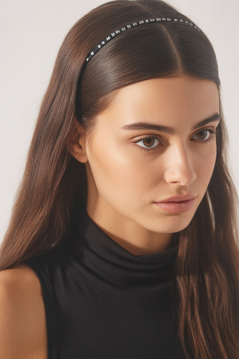 Minimalism meets sparkle in this quietly striking look. The slender rhinestone-edged black headband is subtle enough that it creates a glittering effect that draws attention it does not yell, though. Long hair pulled straight and parted in the center add to the sleek, chic, and completely modern presentation.
