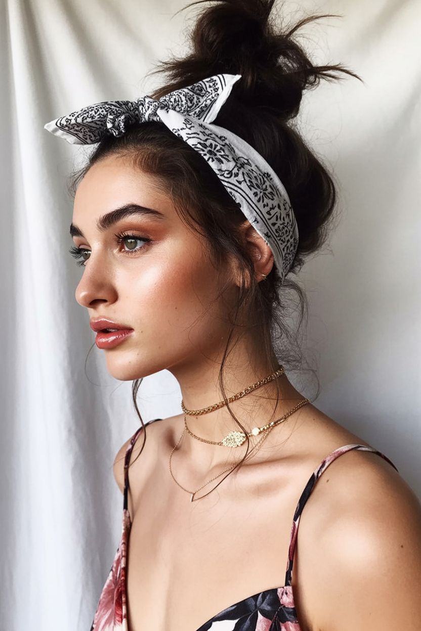 Ready to bring out your inner free spirit? This updo and knotted bandana is instantly summer music festival. It is childish, somewhat subversive and very bohemian cool, in particular with gold accents and natural makeup.