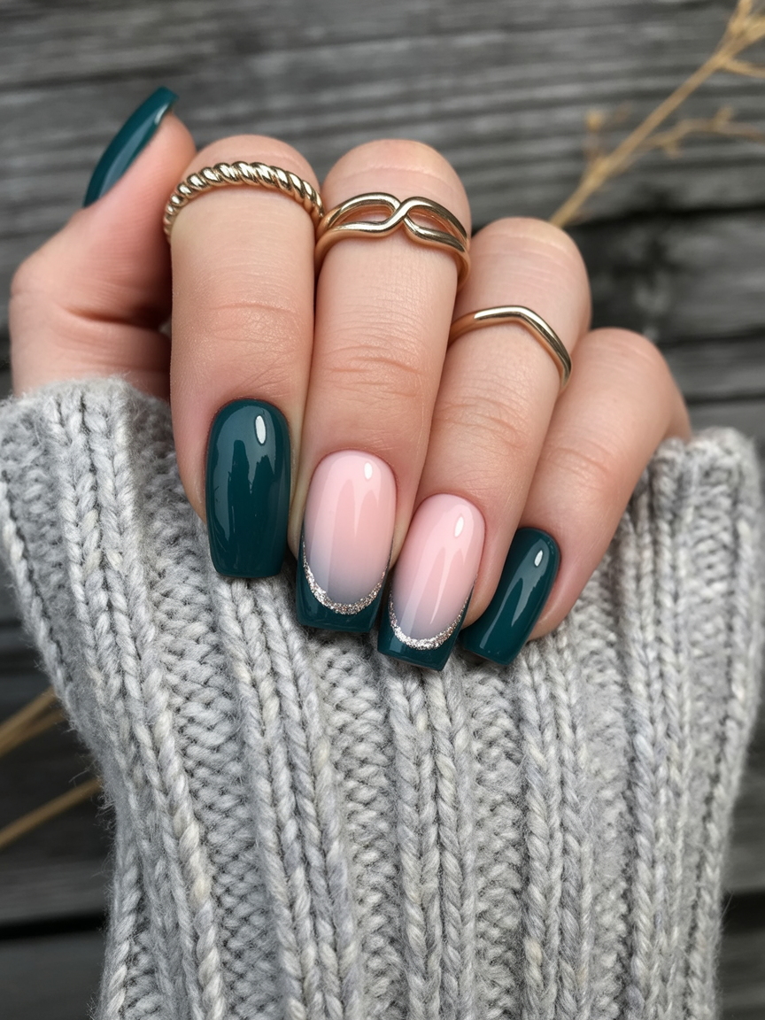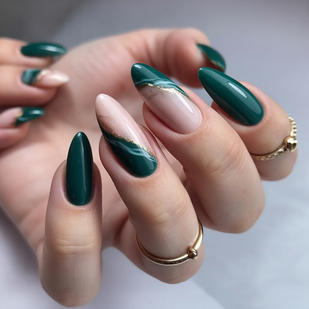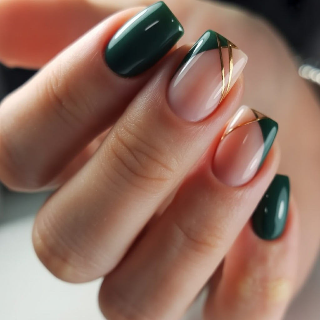 There’s a satisfying sharpness to this design that instantly reads cool and curated. The glossy dark green stands strong on shorter nails, while the nude diagonals laced with golden bands add just the right amount of intrigue. It’s the kind of manicure that makes you feel put together even when you’re wearing sweatpants.