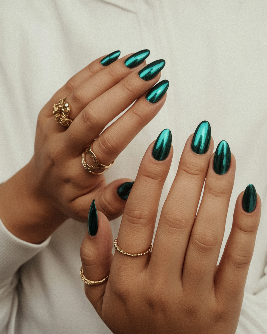 These chrome-green nails are rather reminiscent of superhero nails. They are like you’re wearing armor—but with that extra hint of fashion and whimsy to it. The sort that shows that you’re fearless enough to stand out and perhaps also break some rules here and there.