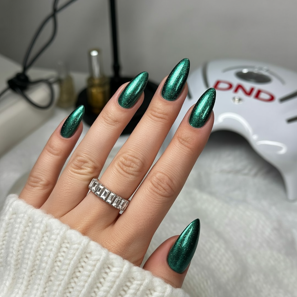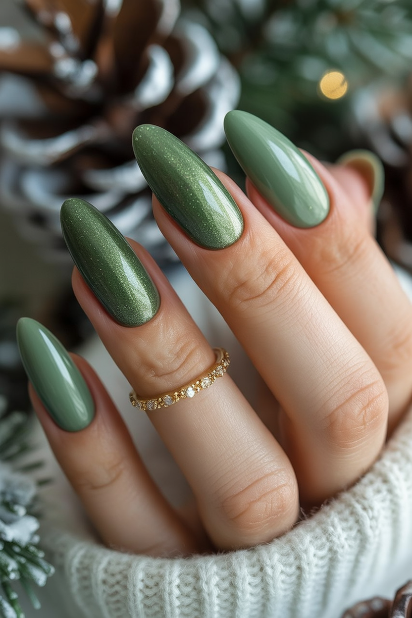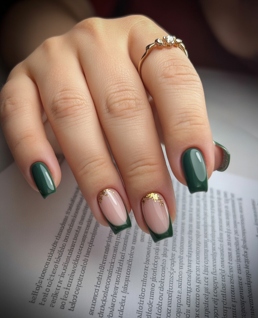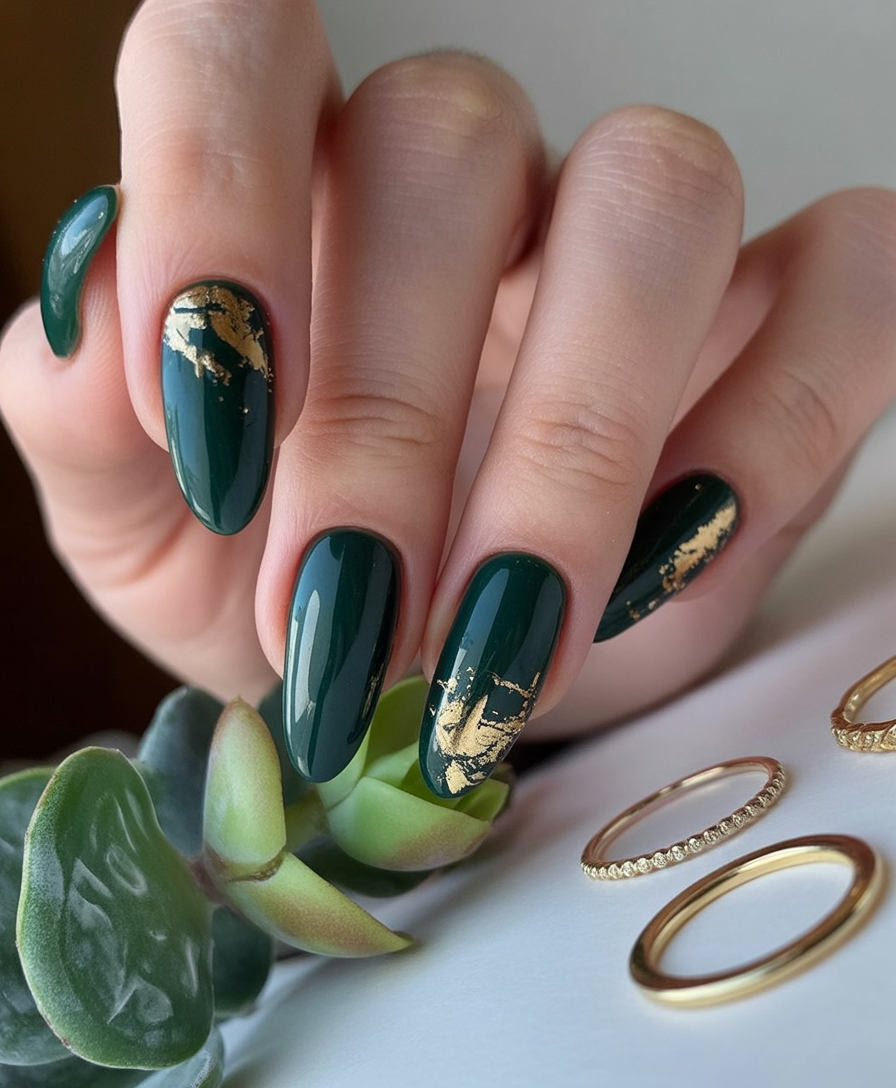 These nails look like something out of an enchanted forest—the dark green base layered with scattered bits of gold creates a rich, almost mythical effect. There’s a quiet drama here, something a little regal and mysterious that draws you in.