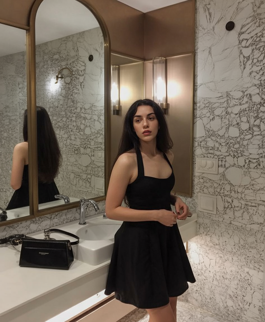 This long, naturally voluminous style feels warm and grounded—the kind of hair that makes you instantly relatable yet effortlessly stylish. The light movement through the lengths gives it a soft, breathable texture, while the natural volume at the roots adds a quiet confidence that pairs beautifully with a classic black halter dress.