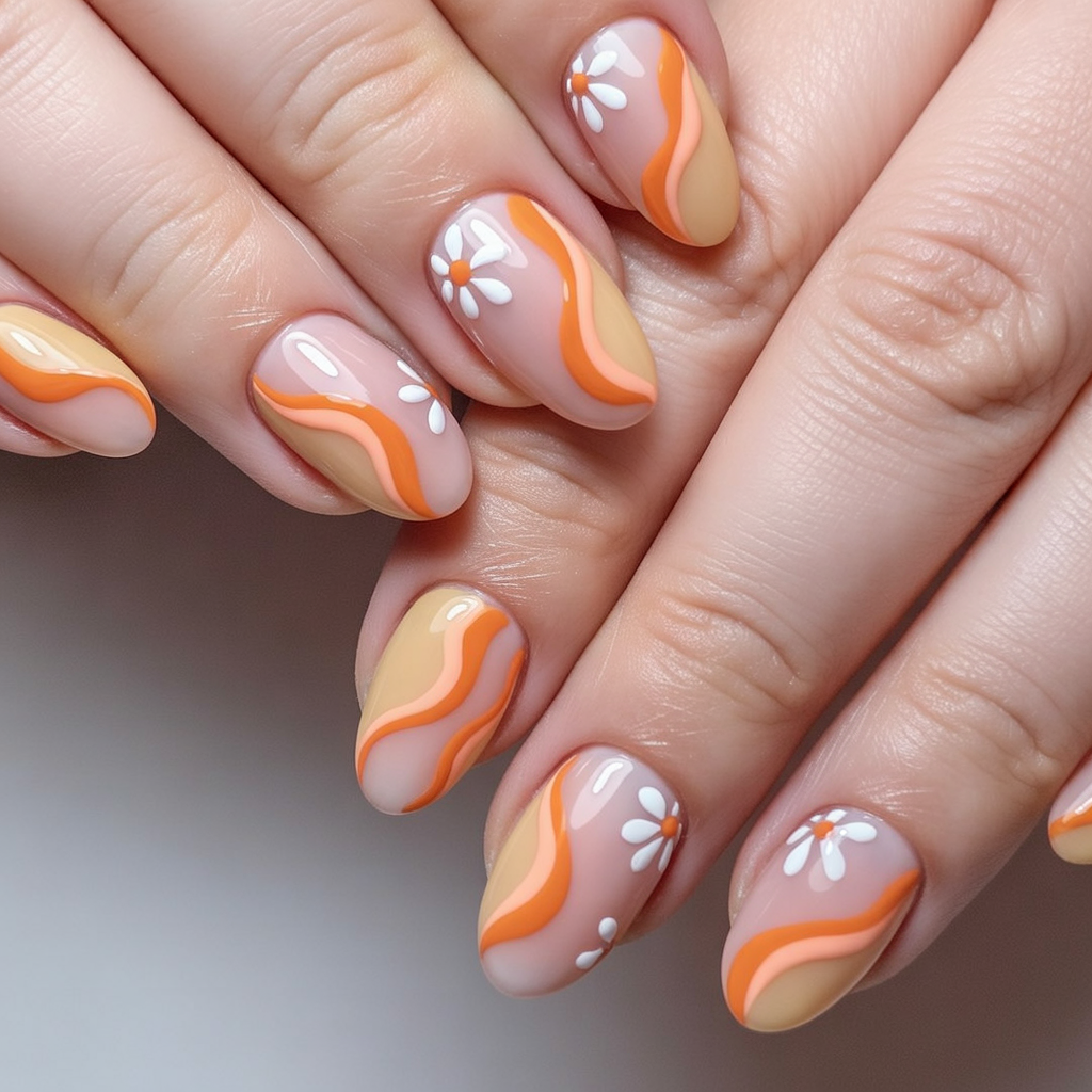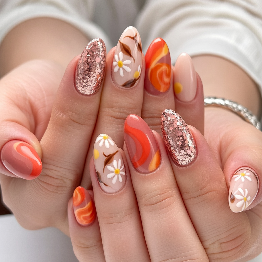 The manicure shines with all the retro vibes between bronze glitters, retro curves, and miniature daisies and looks like a vintage sunset. The color scheme combines coral, orange, and muddy colors in a form that is childish but completely refined.