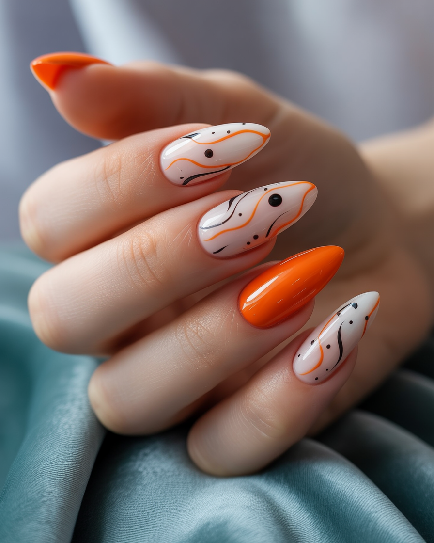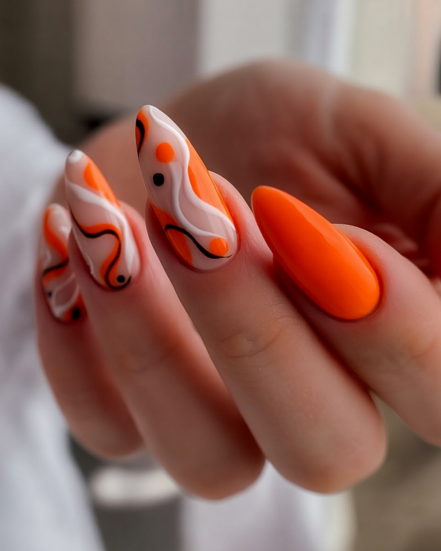 These nails are a kind of loud splash of abstract painting Florid black-orange lines moving over a creamy ground. It is colorful, borderline, and naughty in one, a 90s remix with a new beat of 2025.