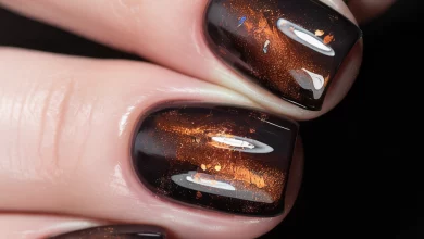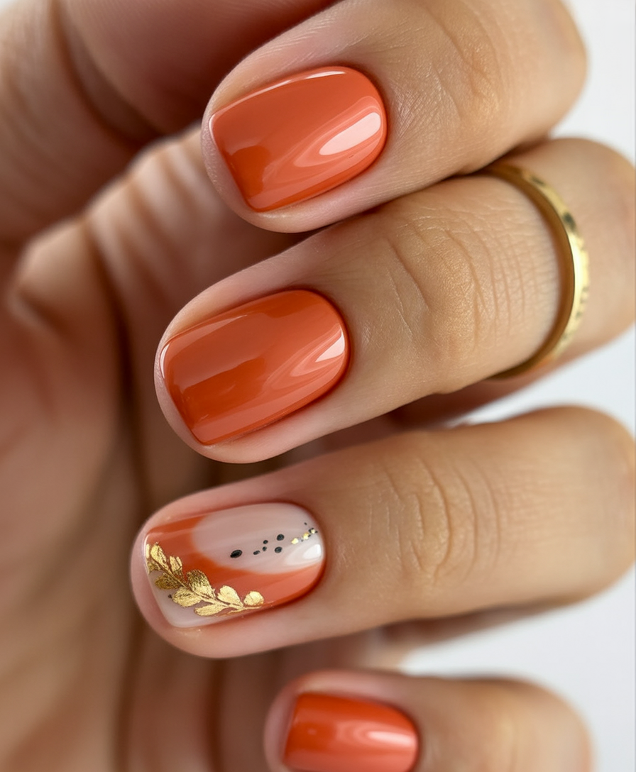 There’s a quiet luxury to these glossy terracotta nails. Just the touch of a golden leaf is enough–as is the finishing stroke of jewelry, when one is going out of the house. It’s elevated, earthy, and effortlessly stylish.