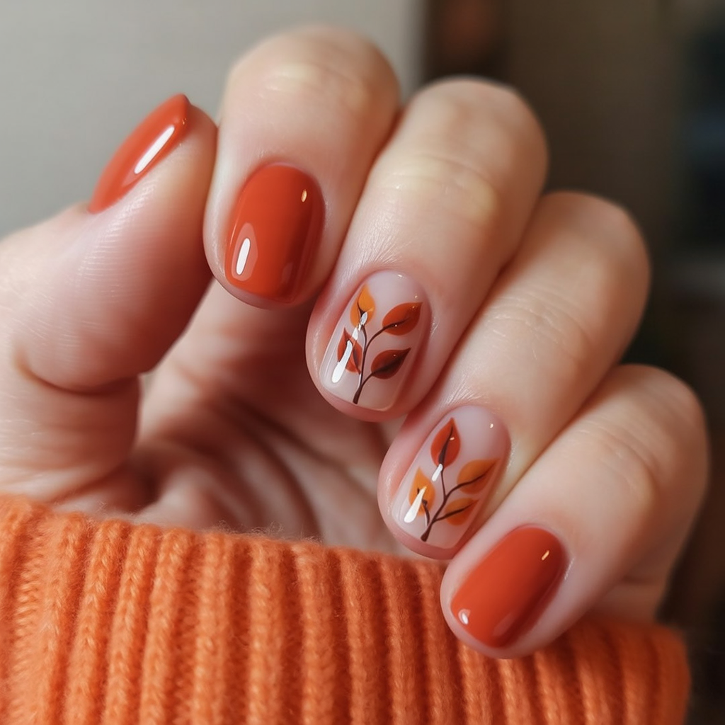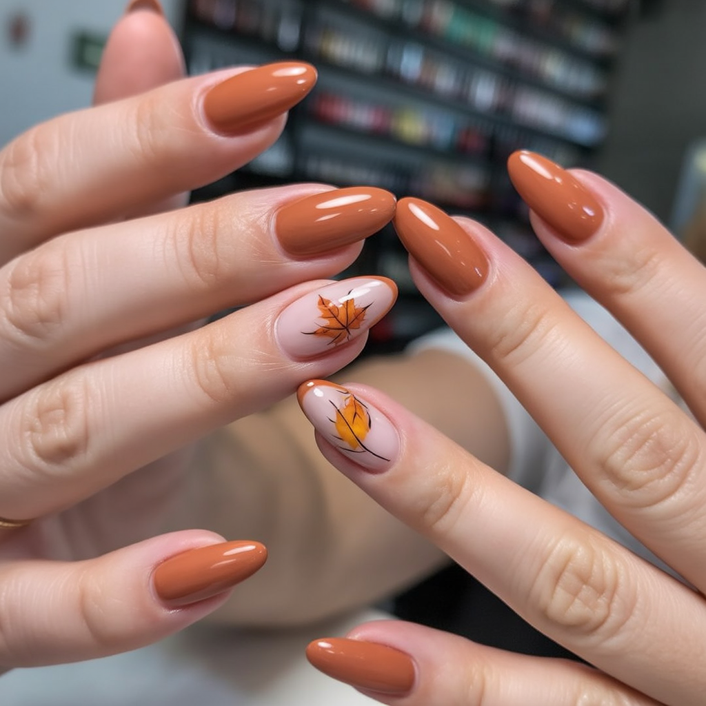 These nails are practically whispering crisp air and cinnamon. This set is your best blanket sweater of fall and winter, with warm terracotta bases and thin leaf details, warm yet appealing.