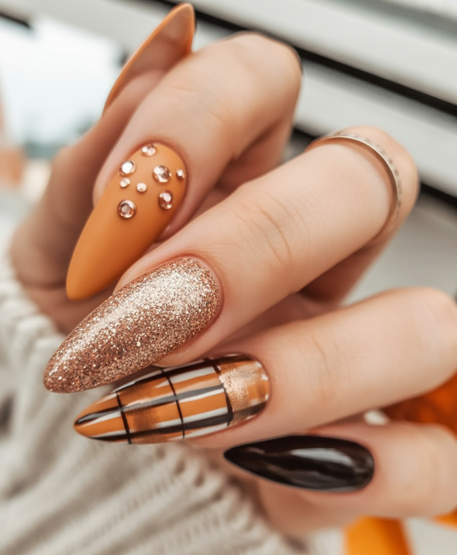 These coffin-shaped nails are definitely a statement. The glimmer puts some festive elegance to it, and the plaid makes it a little bit cool and trendy. In case you prefer playing with rust colors and creating surprising pairings, then this is your fall nail art of choice.