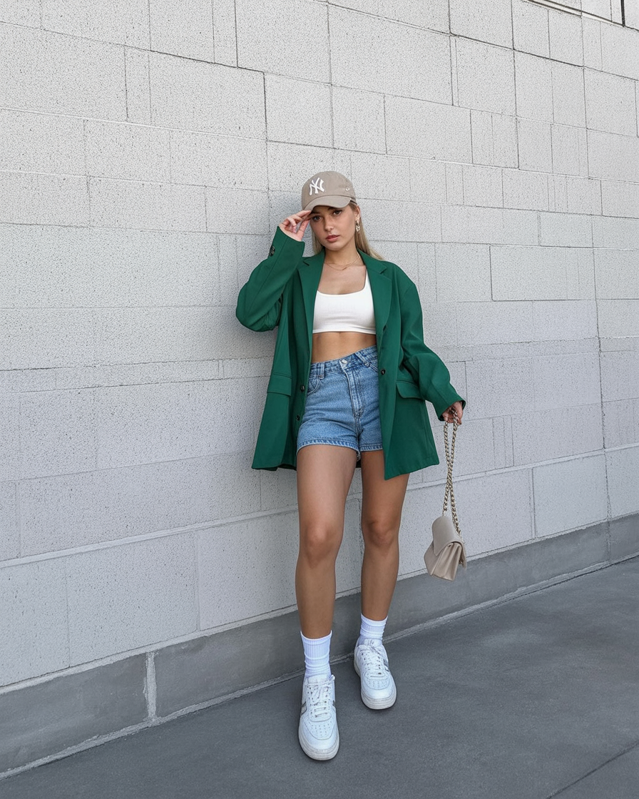 Blazers with shorts? It’s a match made in fashion heaven. This tailored green jacket adds just the right amount of polish to the relaxed vibe of high-waisted denim. The cap and crop top say “street style,” while the structure of the blazer whispers “I’ve got business to handle.”