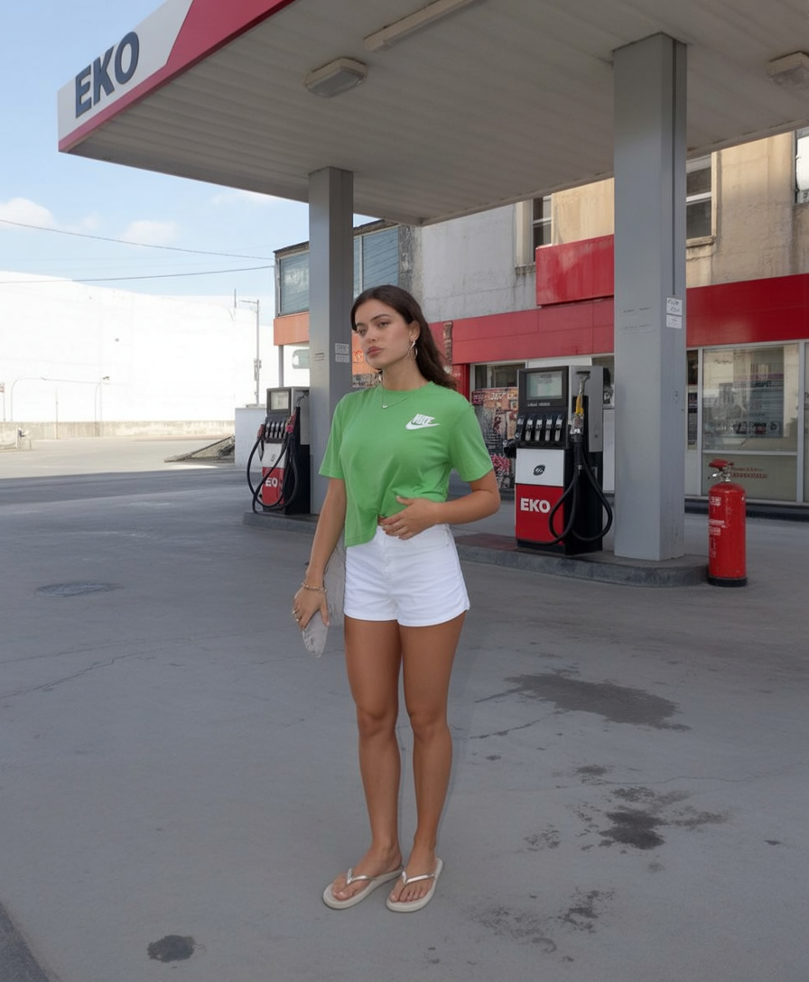 There’s something instantly refreshing about lime green against bright white — it’s like a fashion citrus spritz. The boxy tee adds a sporty flair, while the shorts keep it clean and classic. It’s playful, punchy, and perfect for sun-chasing days when you want your outfit to reflect your energy.