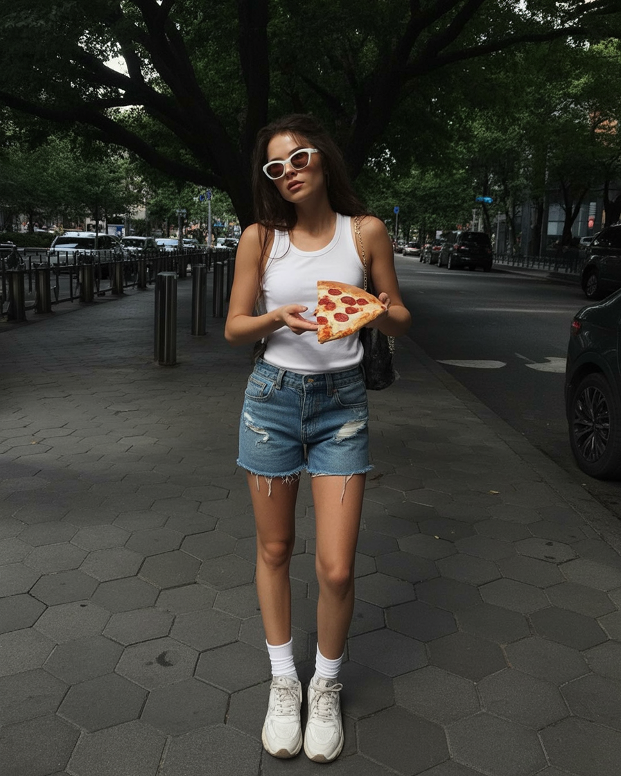 Some outfits just capture a whole vibe — and this one feels like a slow Sunday in the city, soaking up sunshine with a slice in hand. The classic white tank paired with distressed denim shorts is timeless, but the chunky sneakers and retro sunglasses give it that 2026 twist.