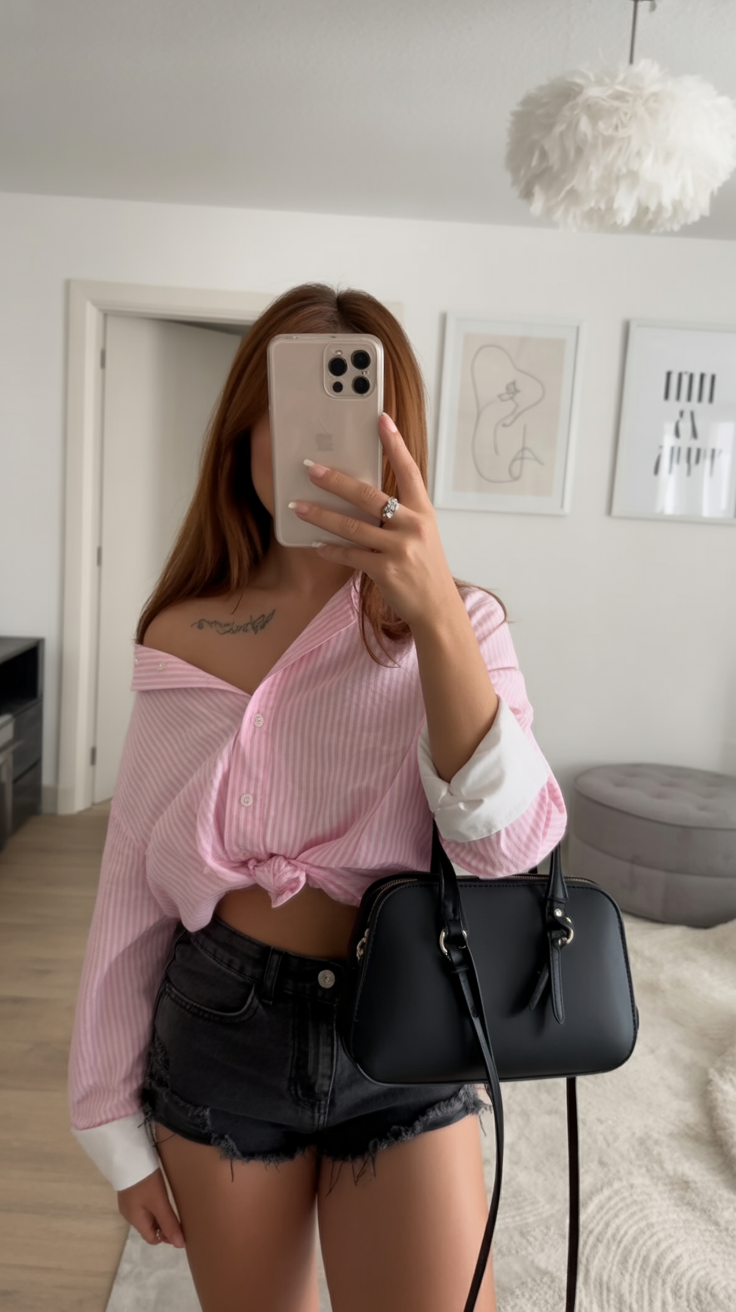 This outfit brings pure vacation energy — the kind where the sun is high, the breeze is warm, and you’re strutting like the sidewalk is your runway. The vibrant pink shirt over a crisp white crop top and fitted denim shorts is sunshine in an outfit.