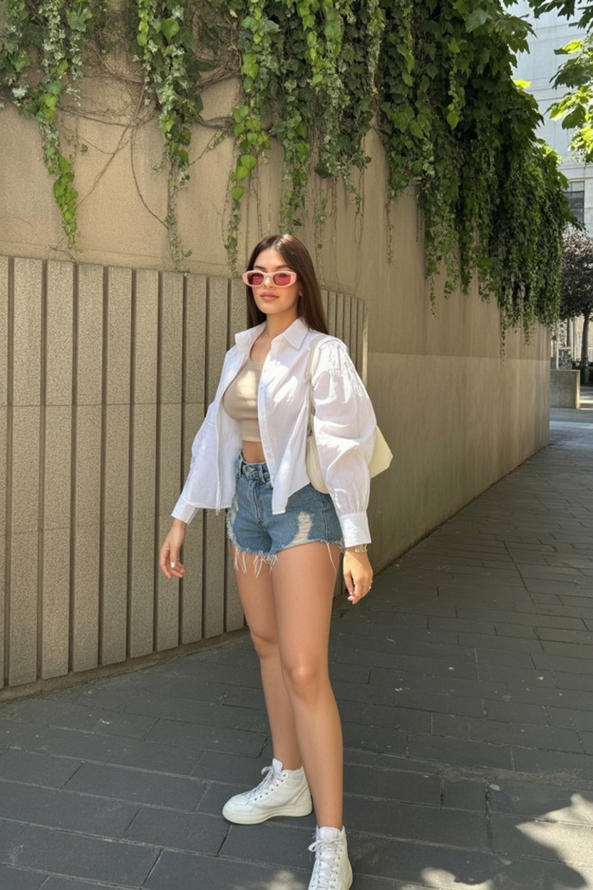 City nights call for something equal parts comfortable and striking — and this outfit nails it. A sheer white shirt layered over a crop tank and rolled-up denim shorts offers just enough drama to feel special without losing that grounded charm.