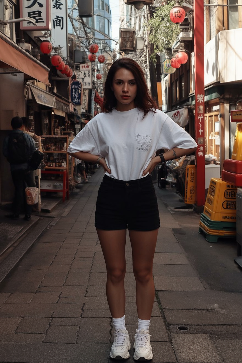There’s real power in simplicity — and this look proves it. A loose white tee tucked into high-rise black shorts sets the tone for a confident, no-nonsense day. The setting could be Tokyo or New York — the aesthetic is that universal.
