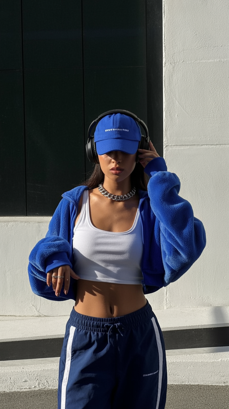 This look is what happens when sporty meets street style. The monochrome blue outfit with cozy textures, bold headphones, and that metallic chain necklace feels like an instant confidence booster. It’s got early 2000s energy in the best possible way — like you’re about to hit a rooftop gym or dance studio.