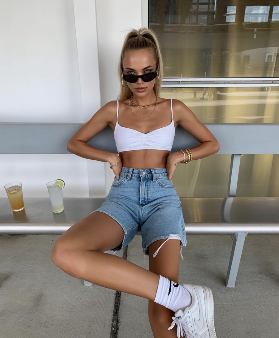 High ponytail, crop top, and longer frayed denim shorts — it’s giving “main character” energy. The balance between bare shoulders and relaxed tailoring makes this a go-to for feeling polished without overdressing.