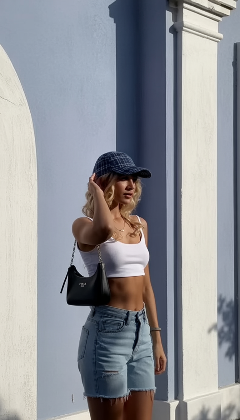 This outfit feels like a breath of coastal air — relaxed, pretty, and full of sunny potential. The blue plaid cap adds a preppy nod, while the soft denim shorts and cropped white tank keep things fresh and flirty.