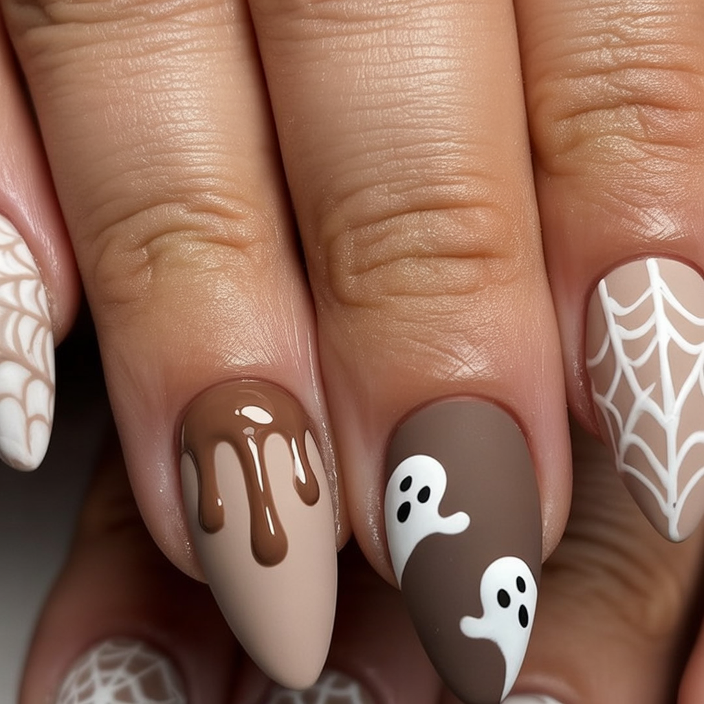 Who says Halloween can’t be cozy? These warm mocha-toned nails are dripping in charm—literally. Featuring ghosties, webs, and chocolatey drips, this appearance has an appearance that your fall favorite latte went to a costume party.