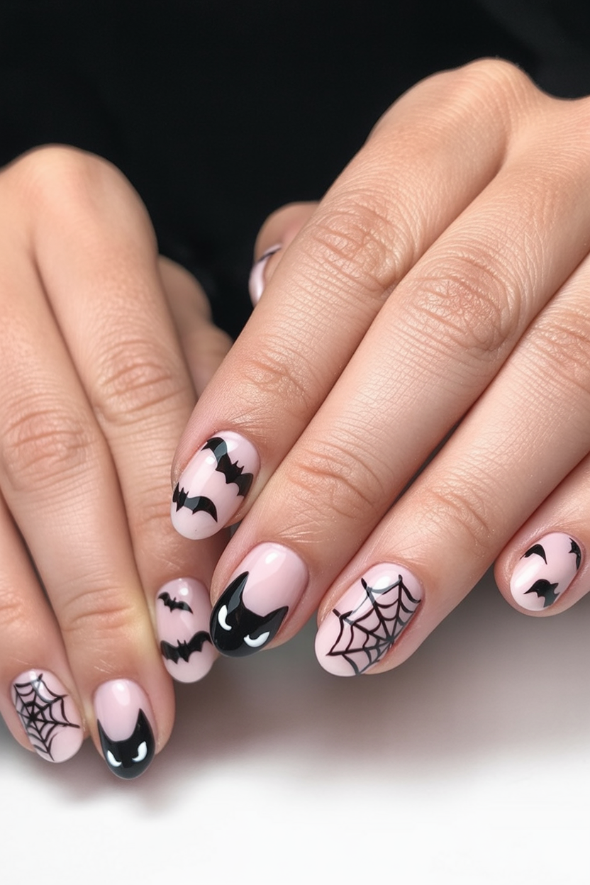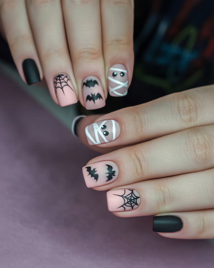 This manicure exudes the feeling of Halloween: sweet, and just a hint of spooky and a bit quirky. With its adorable mummy eyes, comic-style bats, and soft pink contrast, it’s giving “Trick-or-Treat but make it chic.” The combination of OS-like greasy webs and glossy black nails gives each finger dimension, as well as some twinkle.