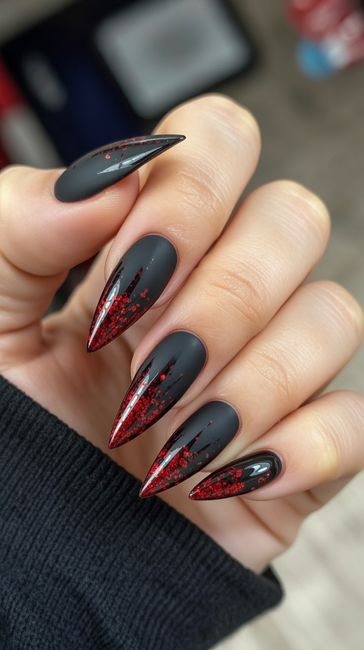 They are nails, and they resemble vampires in a movie when they walked and left a light trail of spangling blood. Crimson flecks line the deep matte black background which is reminiscent of freshly spilled secrets. It is exotic, brooding and has that perfect degree of horrific.