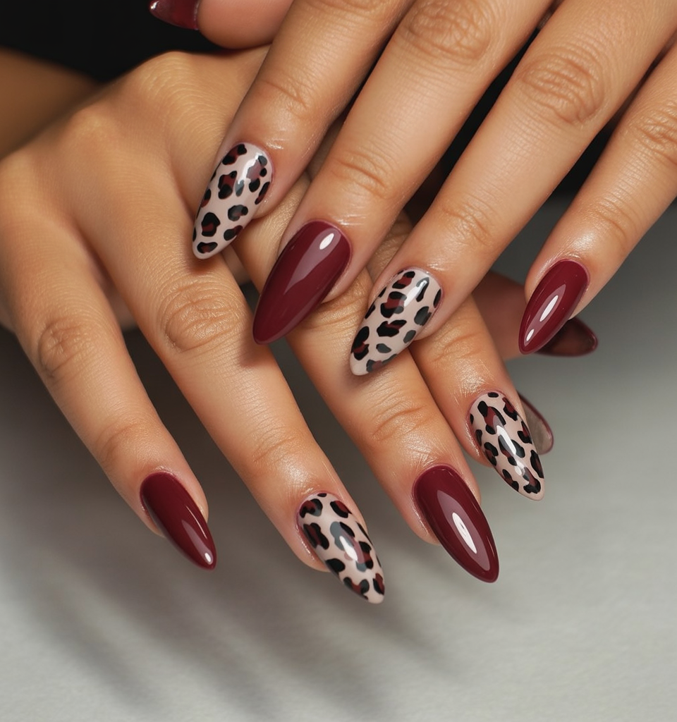 Halloween, but make it fierce. These almond nails in berry have a deep burgundy wine blended with a leopard like feel. It’s sultry, unexpected, and totally wearable past October 31st. It gives the style- conscious woman a spooky-but- sexy bite to your outfit.