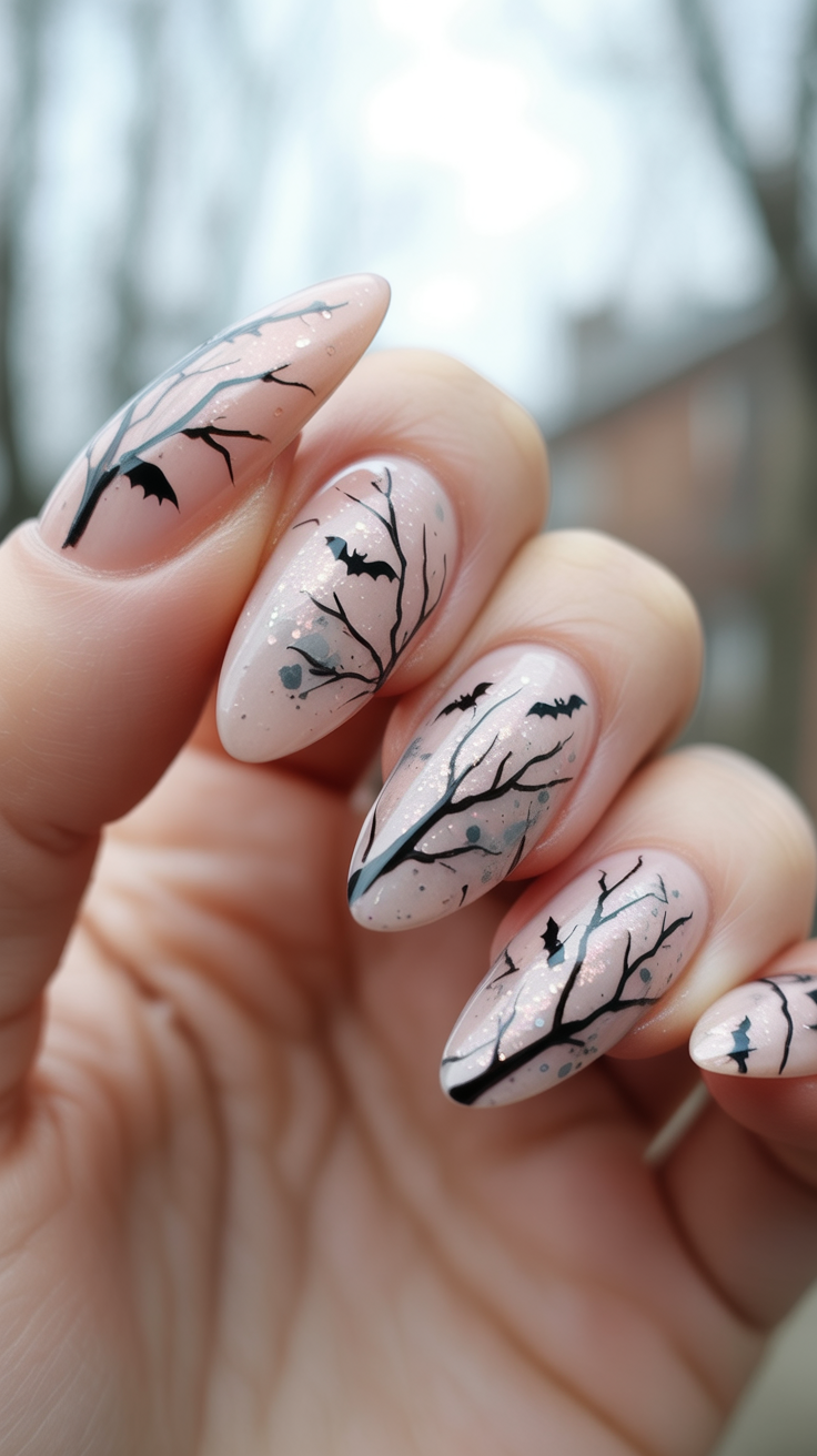 The sheer nails are delicate, dreamy, even a bit eerie a story is being told. A nude base is sprinkled with sparkles and some tiny bats are flying away, out of the frame; the branches of a dark tree are stretched across it. It’s quiet and haunting in the most enchanting way.